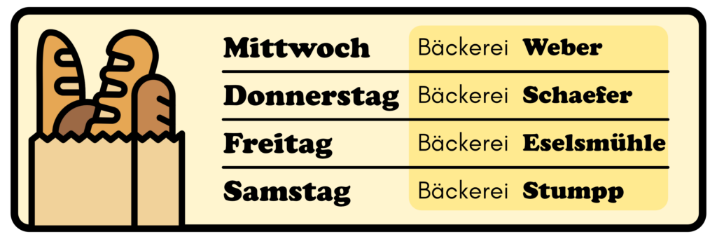 - Kleinteile: Brezel, Laugenweck, Croissant, Vollkorn-Saatenweck, Vollkorn-Dinkel-Weckle